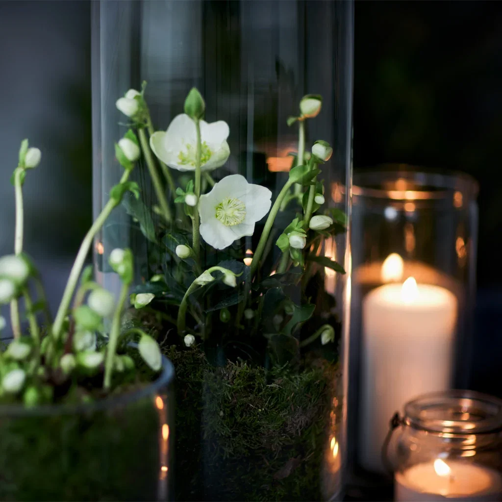 Nyårsstämningen blir fulländad med många små ljuskällor, såsom blockljus, värmeljus och gärna en ljusslinga mellan blommorna.