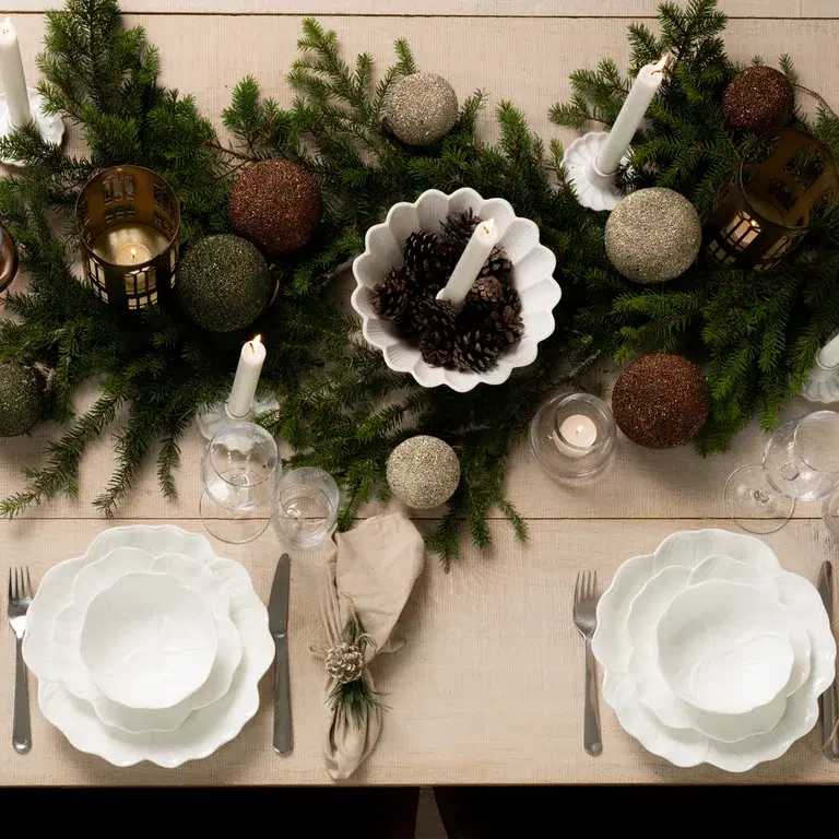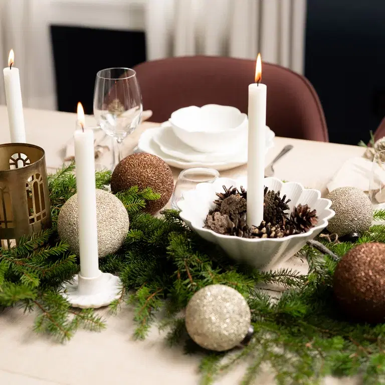 Duka bordet för en stämningsfull advent som speglar naturens lugn. Använd vitt porslin som bas och kombinera det med neutrala färger som brunt och detaljer i metall för ett harmoniskt uttryck. Granris och kottar ger en naturlig känsla, medan stearinljus i olika höjder skapar en varm och stämningsfull atmosfär.