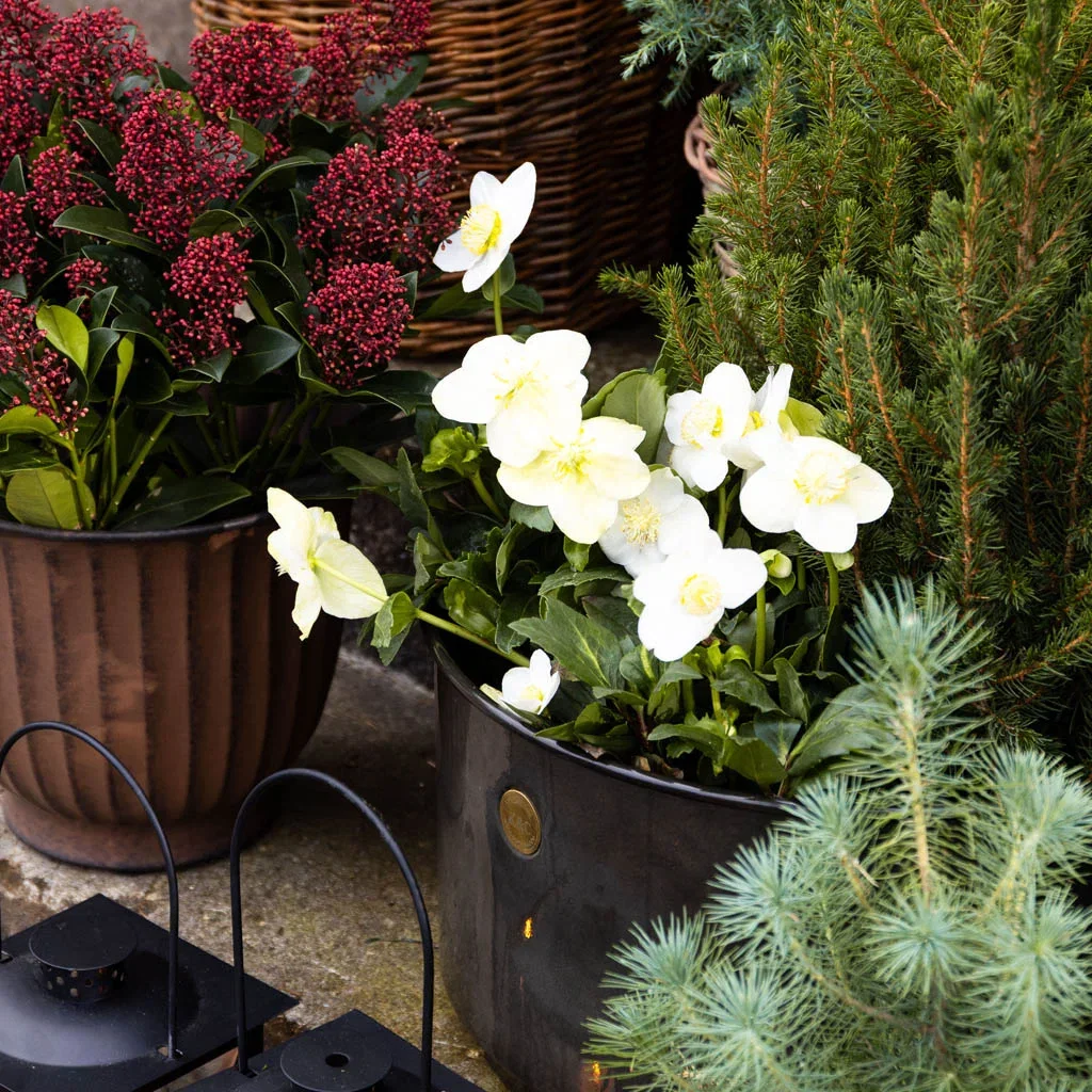 Julrosen är en perenn med vackra blommor och vintergröna blad som kommer att ge dig massor av glädje under senhösten och vintern. Den tål en del minusgrader och ger ett vackert välkomnande på trappan eller vid entrén till julen. Plantera till exempel några julrosor i en kruka eller korg och dekorera med grön mossa och grangrenar. Placera den tillsammans med vintergröna barrträd i krukor på trappan eller vid entrédörren.