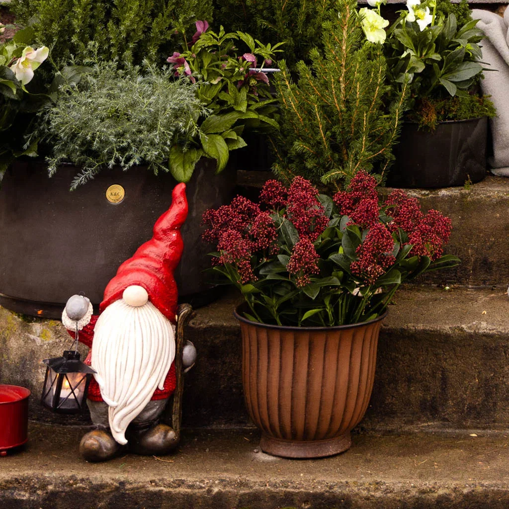 Placera en eller två charmiga jultomtar bredvid vintergröna barrträd, julrosor och lyktor vid entrén. Avsluta med en dörrkrans.
