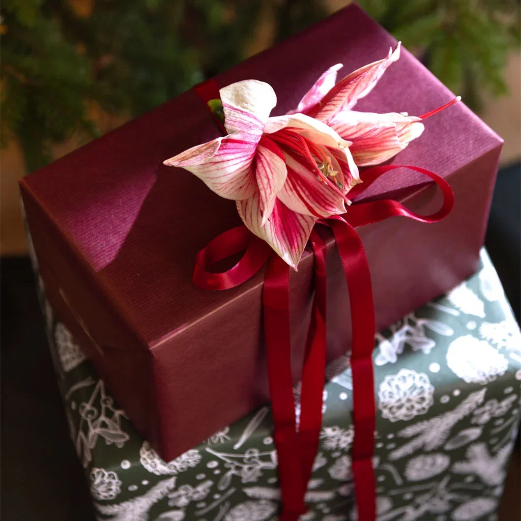 Under den eleganta granen finner du julklappar som skimrar i guld med vackra satinband, och paket i burgundy och skogsgrönt. Här hittar du presentinslagning till en elegant jul.