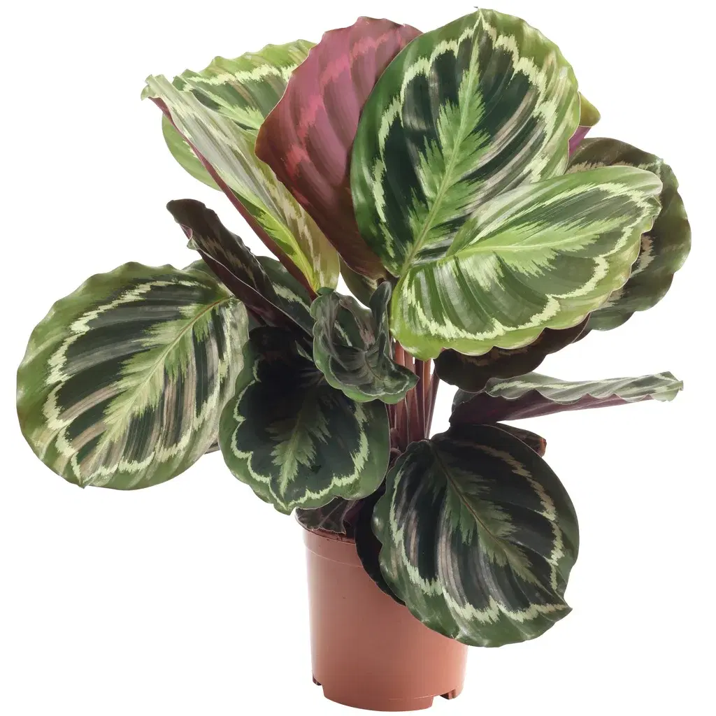 Den här kalateans stora, runda blad förför sin betraktare med dekorativa mönster i gröna nyanser och purpurfärgad undersida. Den är oemotståndligt vacker! Den trivs i ljusa och halvskuggiga lägen utan direkt sol.