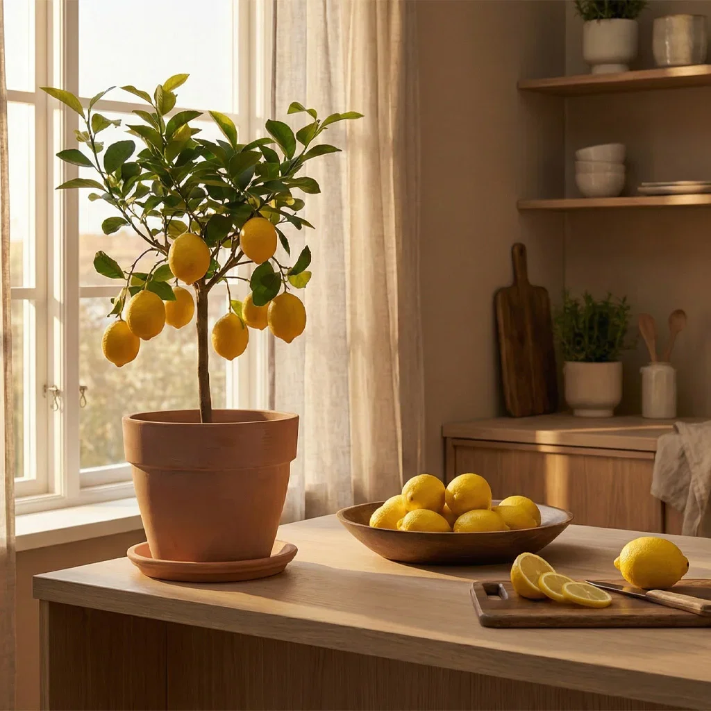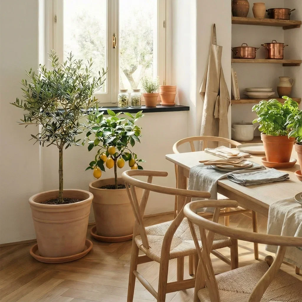 Medelhavsväxter som olivträd, citrusträd, lager och rosmarin tillför doft, struktur och levande grönska, och skapar en varm, autentisk känsla av sol, jord och matlagning. De tycker om mycket ljus och kan ofta trivas både inne i köket och utomhus under sommaren. Under vintern behöver de generellt en viloperiod med svalare temperatur.