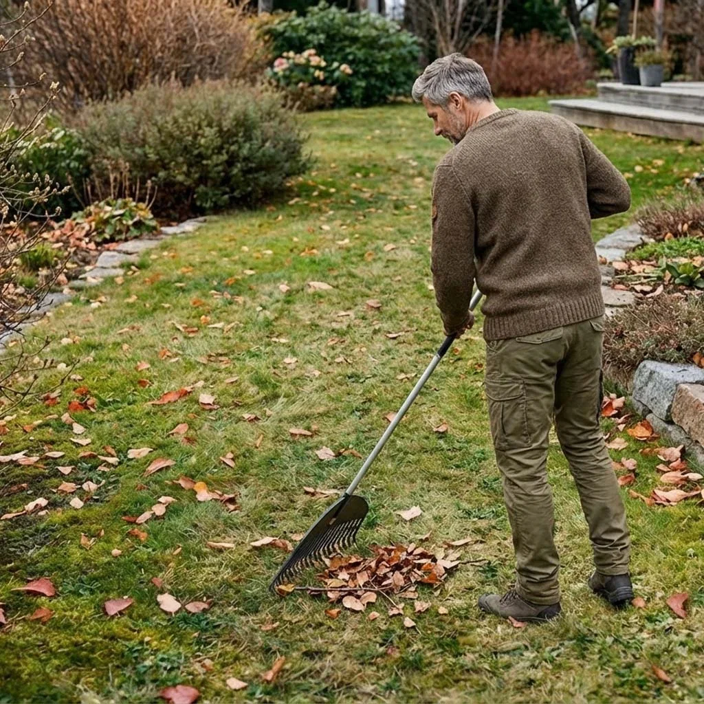 • Ta bort löv, kvistar och dött gräs med en lövräfsa.
