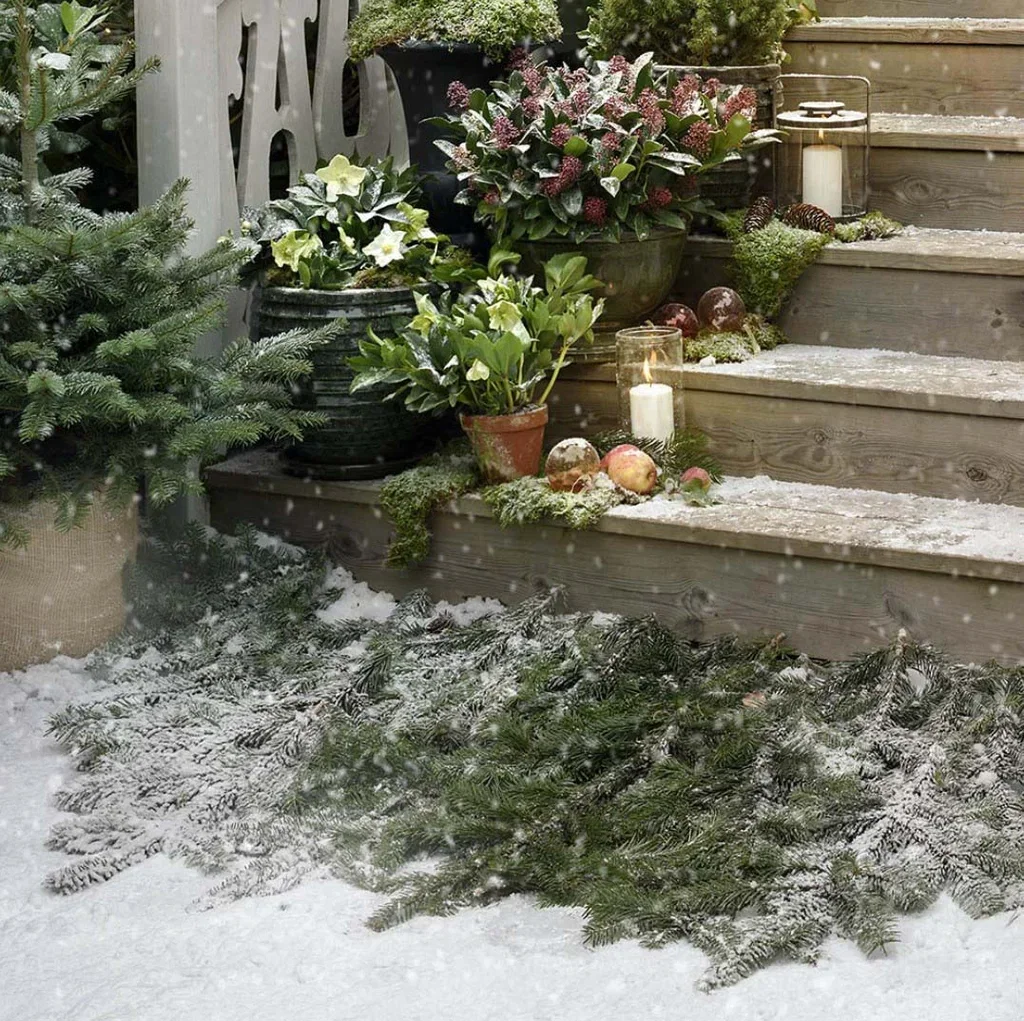 Lägg en matta av granris framför entrén, jätteskönt att trampa av smuts eller snö på innan du går in. Du kan lägga granriset löst eller, om du tycker att det blir för halkigt, kan du lägga kvistarna omlott och sedan vira en ståltråd kring. Tänk på att lägga dem åt olika håll så att du bevarar den mjuka yvigheten i granriset.