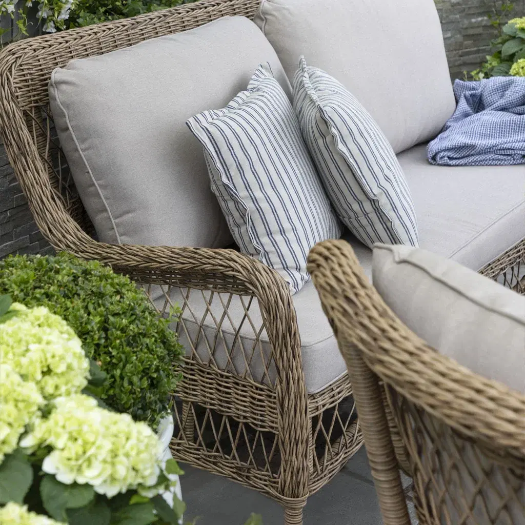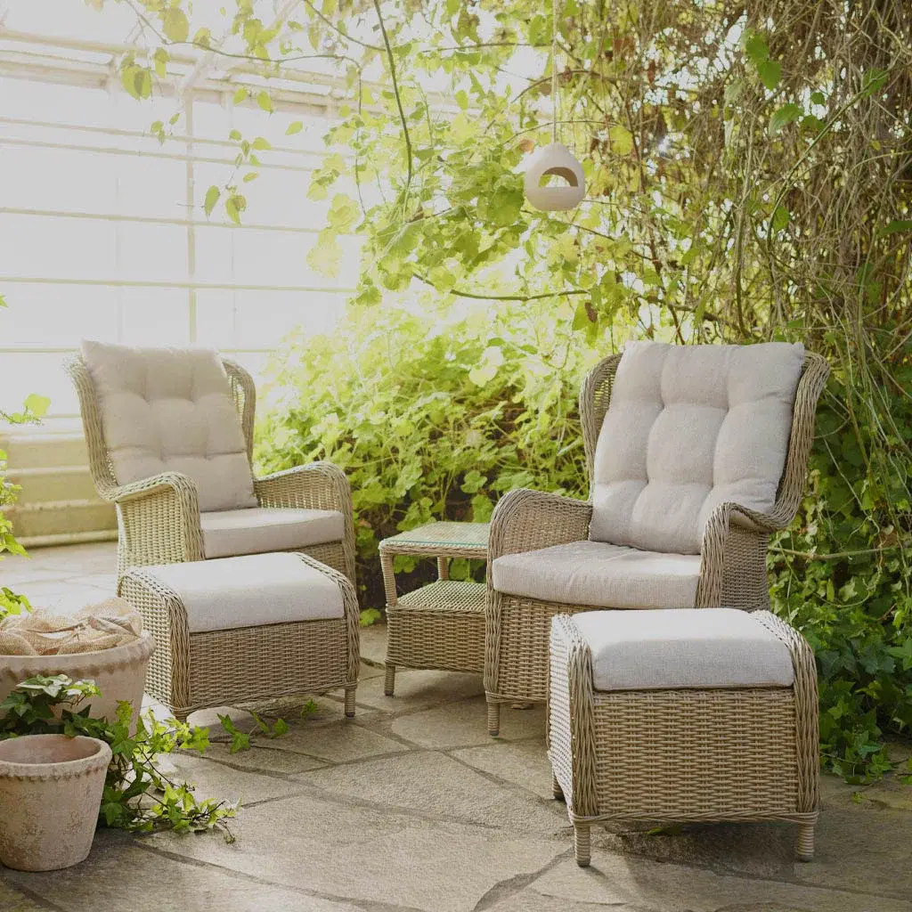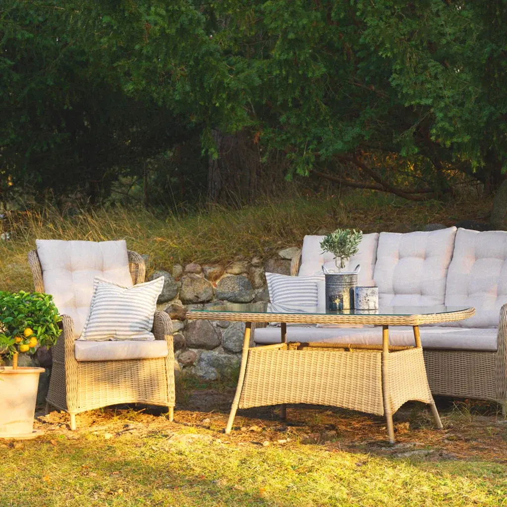 Möblerna har en lätt men stabil ram i aluminium och är klädda i elegant och slitstark konstrotting. Detta gör möblerna både väderbeständiga och lätta att underhålla.