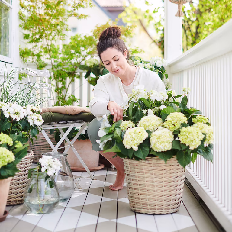 Krukväxthortensia (inomhushortensia) är perfekta inomhusväxter, men kan flyttas ut på balkongen eller ställas i trädgården under sommaren (när det är över 15 grader även nattetid). Ge näring, till exempel surjordsgödsel varannan vecka.